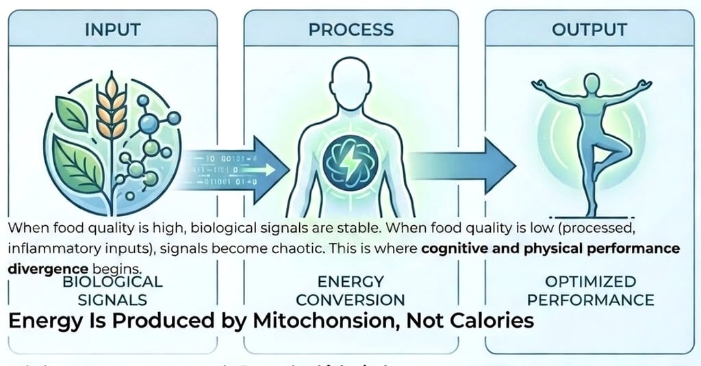 When food quality is high, biological signals are stable. When food quality is low (processed, inflammatory inputs), signals become chaotic. This is where cognitive and physical performance divergence begins.
