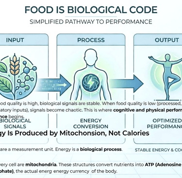 Food is not matter; it is instruction. Learn how to optimize your biological signals, mitochondrial health, and cognitive performance through biologically compatible nutrition.